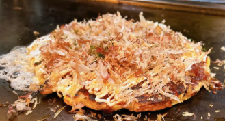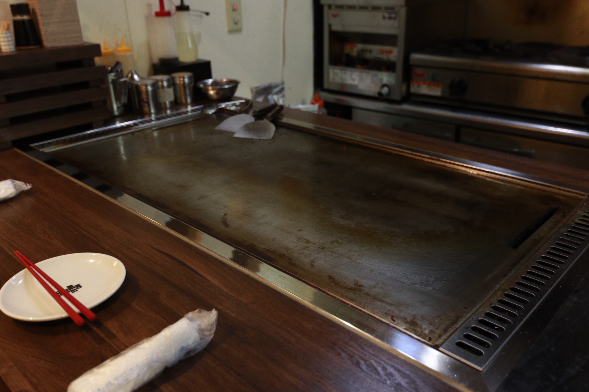 鉄板の前で焼き上がる音と香りを楽しみながら、